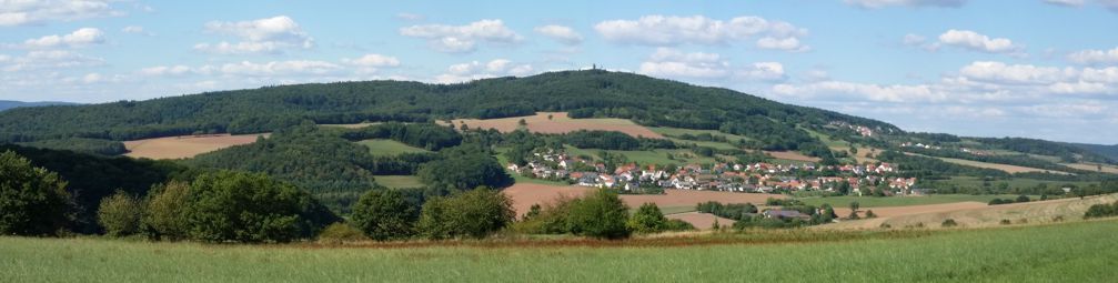 Von nun an geht es zunächst steil bergauf durch den sogenannten "Leimel" hinauf zur "Etschberger Höhe". Dort angekommen rasten wir erst einmal und schauen uns um. Links blicken wir zum Ort "Etschberg" und im Hintergrund sind links der Remigiusberg und rechts der Potzberg zu sehen.